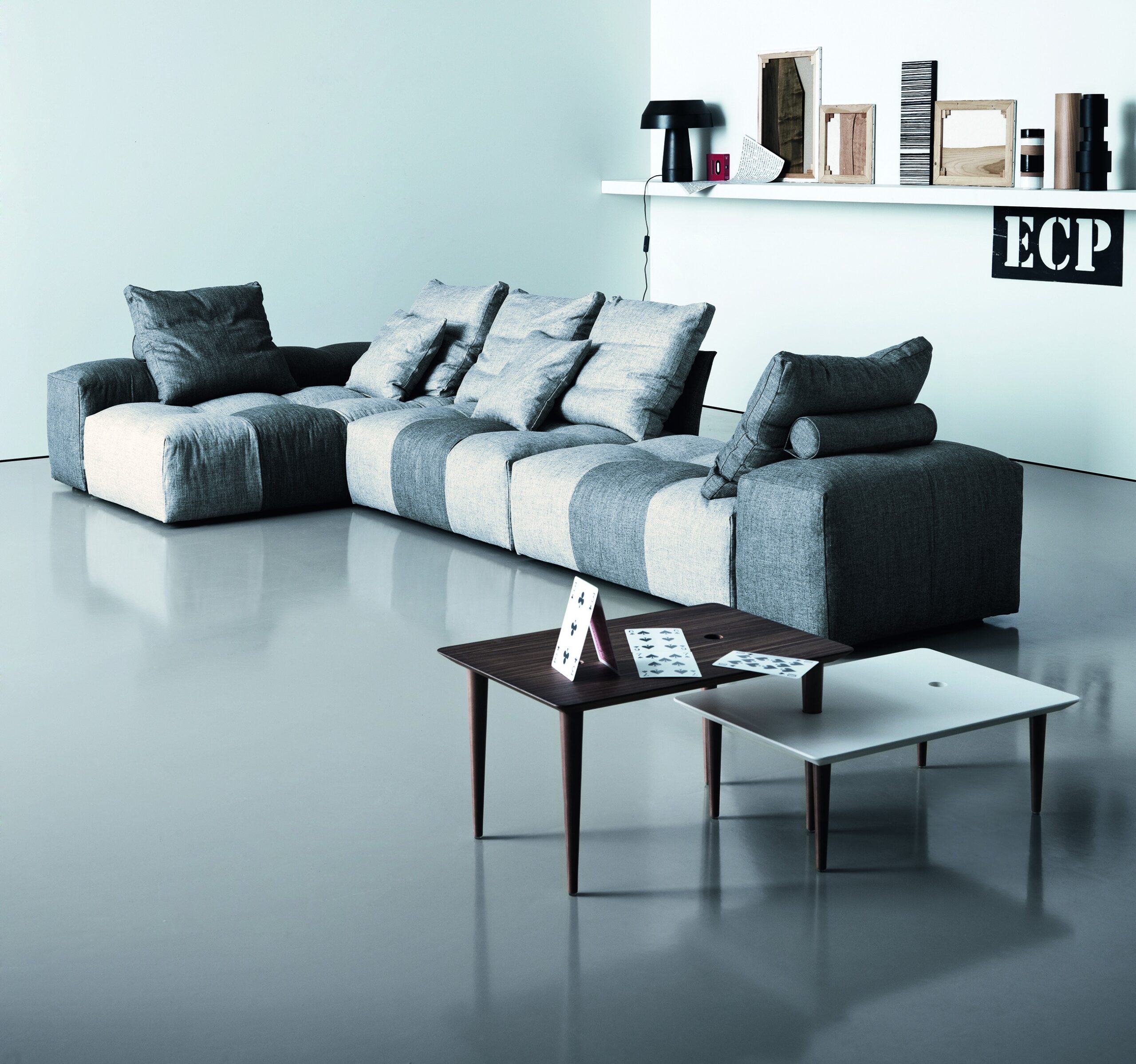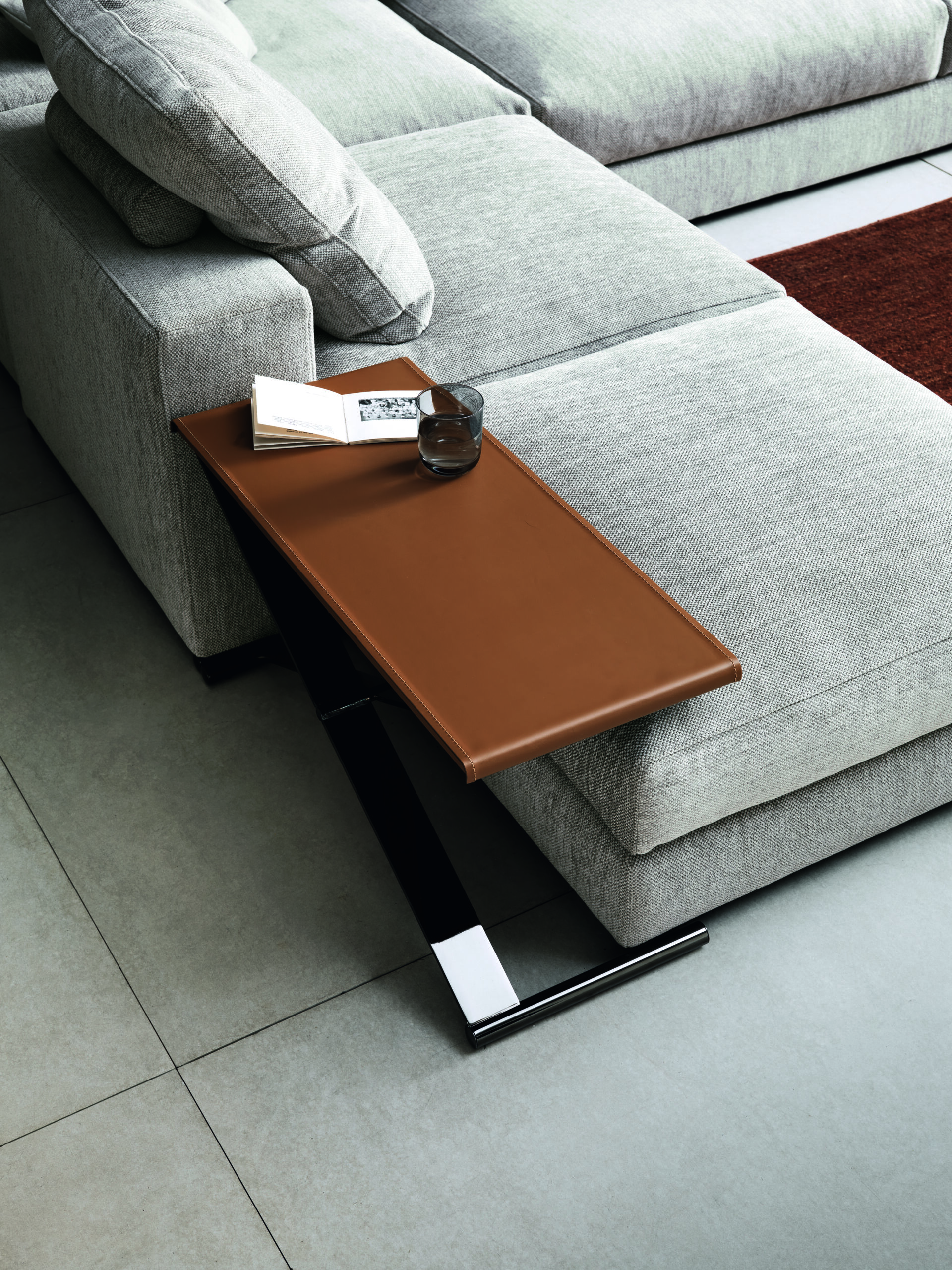 elegante, le sedute sono appoggiate su una base di metallo rivestito in tessuto o in pelle, sollevato da terra su piedi in metallo. Raffinati accessori completano il sistema: i tavolini d’appoggio in due diverse dimensioni sono realizzati in legno noce canaletto. Completamente sfoderabile.
