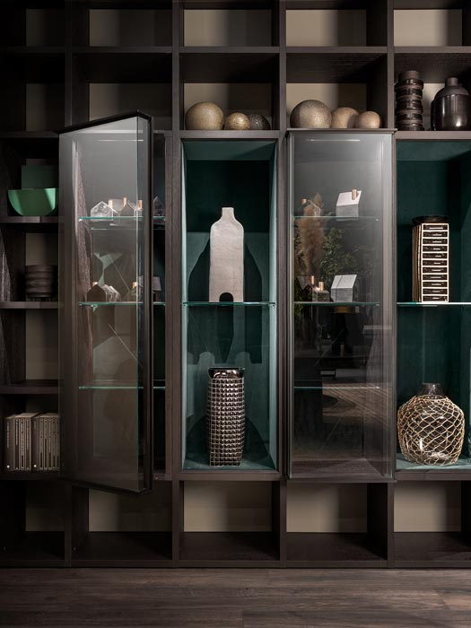 Per pareti multifunzione con cablaggi integrati per strumenti multimediali. Agli scaffali a giorno possono essere aggiunte ante e contenitori; terminali a giorno e ripiani in legno con illuminazione integrata in aderenza allo schienale, per un gradevole effetto soffuso. Arricchiscono il programma, ante a filo e aggettanti, disponibili anche in versione doppia e angolare. Vani con fondali in velluto e ripiani in vetro pensati per creare quinte dal fascino seduttivo dove esporre gli oggetti più preziosi.