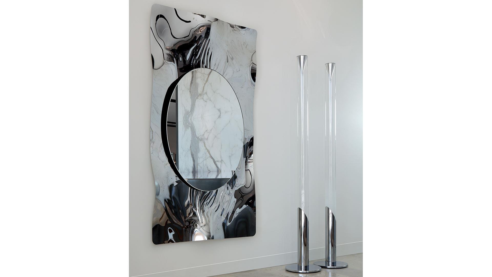 Lussuosa, eccentrica ed elegante, la decorazione diventa protagonista. A catturare lo sguardo sono le incisioni verticali che percorrono la superficie dell’anta, alternandosi come raggi discontinui e disegnando dinamici motivi paralleli. Lucide o opache, impreziosiscono i vetri e gli specchi delle ante. Le maniglie sono ricavate a tutta altezza all’interno dell’anta e sono realizzate in alluminio laccato o con finitura metallizzata.