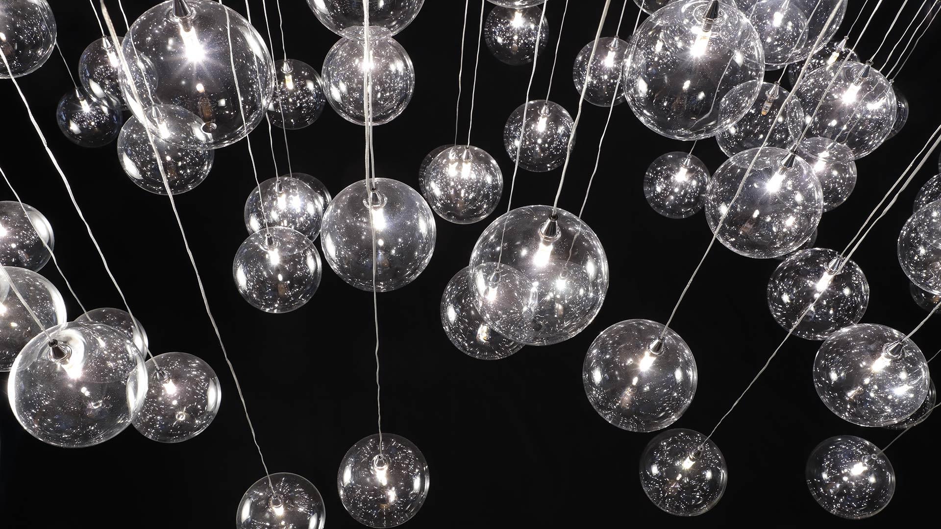 il cristallo industriale, affascinante nella sua lineare essenzialità, arricchito e riscaldato con forme e colori tipiche dell’artigianato veneziano
