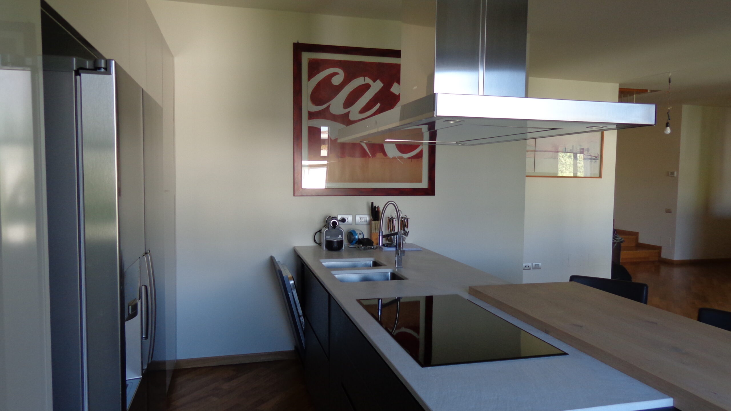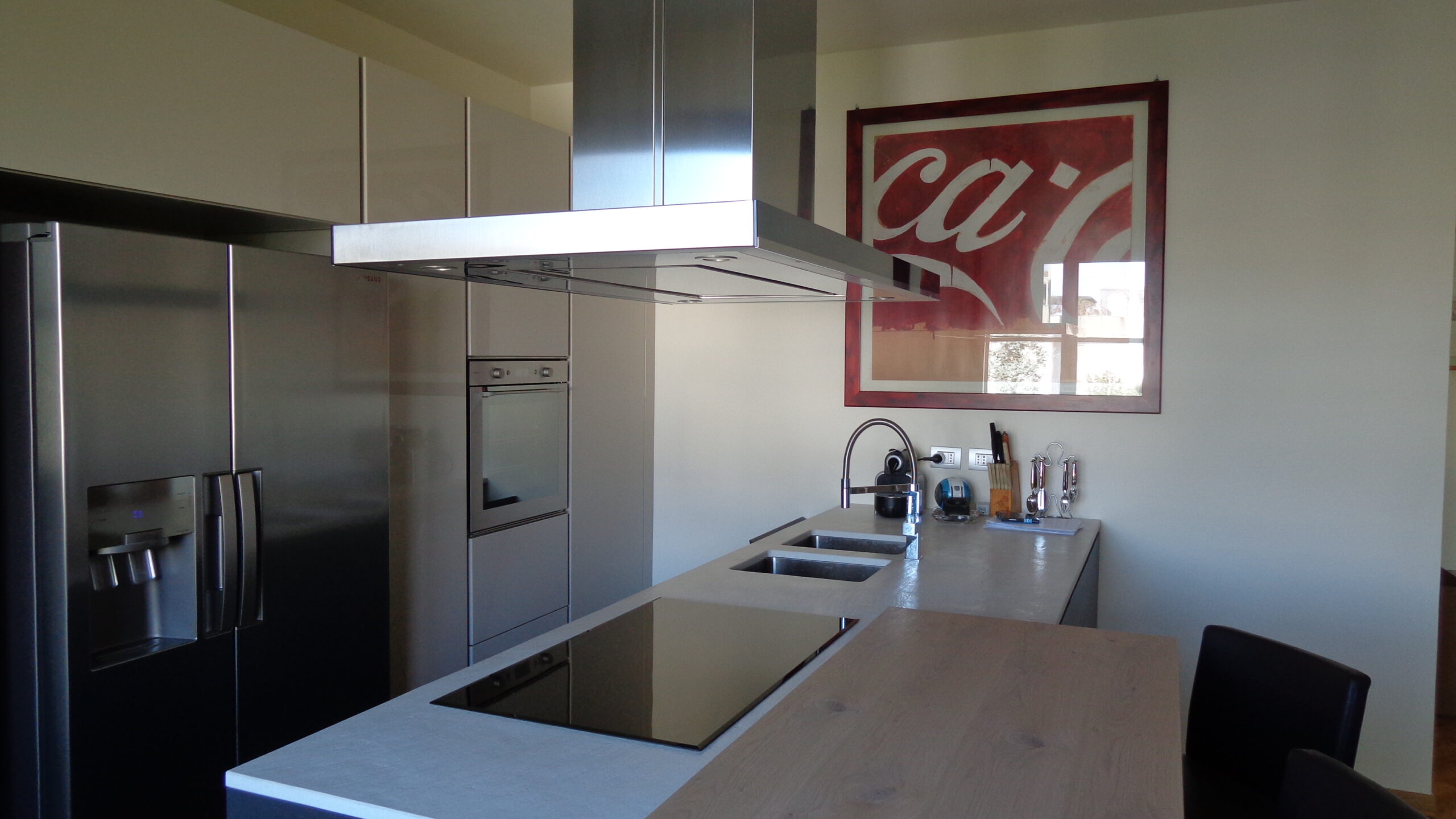 Per gli stessi clienti abbiamo realizzato la cucina: Cucina Viva in cementina e il soggiorno: Soggiorno in vetro laccato.