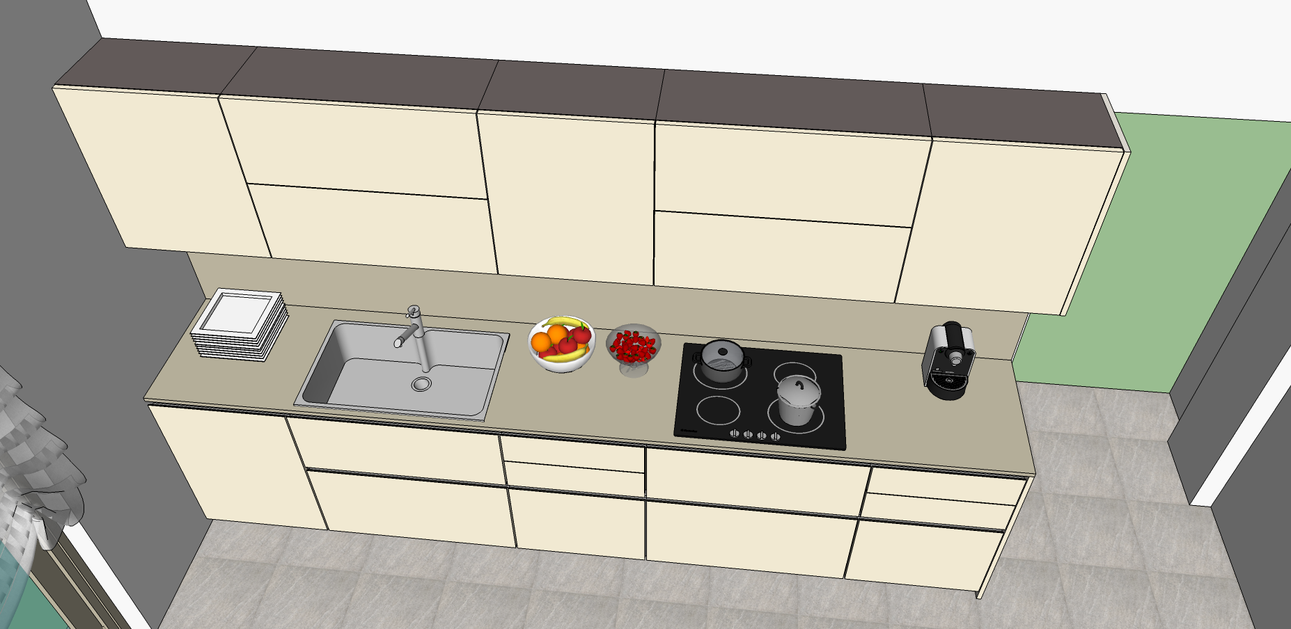 Le ante sono state realizzate in melaminico canapa, abbinate a strutture in melaminico grigio londongray e a gole e zoccolo h.6 in alluminio.