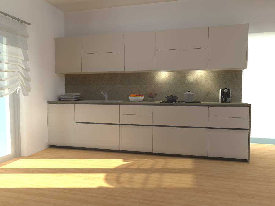 Le ante sono state realizzate in melaminico canapa, abbinate a strutture in melaminico grigio londongray e a gole e zoccolo h.6 in alluminio.