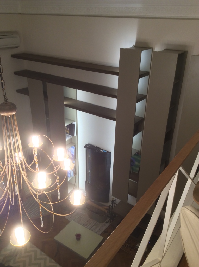 Pensili libreria laccati opaco corda e mensole in legno finitura rovere tabacco.